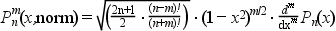 When n and m are scalars, legendre(n,m,x) evaluates the associated Legendre function Pnm(x) at all the elements of x. The definition used is :