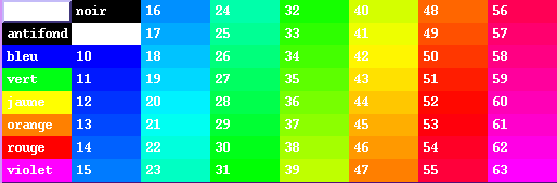 La carte de couleurs présentée ici est celle chargée par défaut. Bien entendu si vous avez changé de carte de couleurs en utilisant le menu correspondant, c'est la carte de couleurs courante du logiciel qui sera affichée.